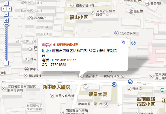 • 导航到南昌中山皮肤病医院即可。具体地址南昌市西湖区站前西路167号(新中原剧院旁)